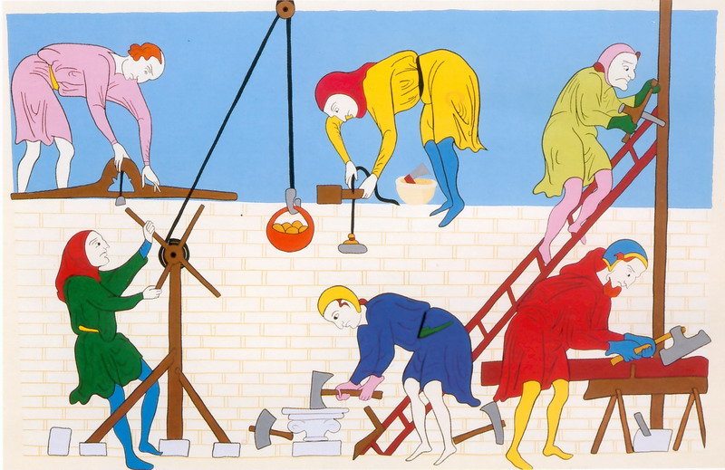 The building of the church19931 panneauDimensions100 X 150 cmMatériauacrylique sur boisGerald of Wales & Copistes UtopiesCopie d’une enluminure médiévale présentant des constructeurs.
